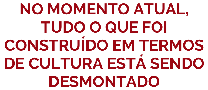 Mas tudo isso – ou o que restou disso – está sendo desmontado de forma desorganizada, prejudicial e sem nenhum critério. Assim, o fazer cultural brasileiro, com as honrosas exceções de sempre, vem se afastando das questões urgentes e fundamentais à sociedade, preferindo adotar, como se cultura fosse, o verniz midiático e ligeiro dos discursos das corporações dominantes no chamado “mainstream”. A isso se vem reduzindo o debate cultural brasileiro em tempos recentes.